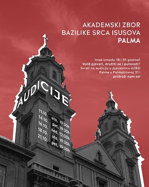 Audicije se održavaju u pjevaonici AZBSI Palma (dvorana bl. Ivana Merza u dvorišnoj zgradi u Palmotićevoj 31) u sljedećim terminima: